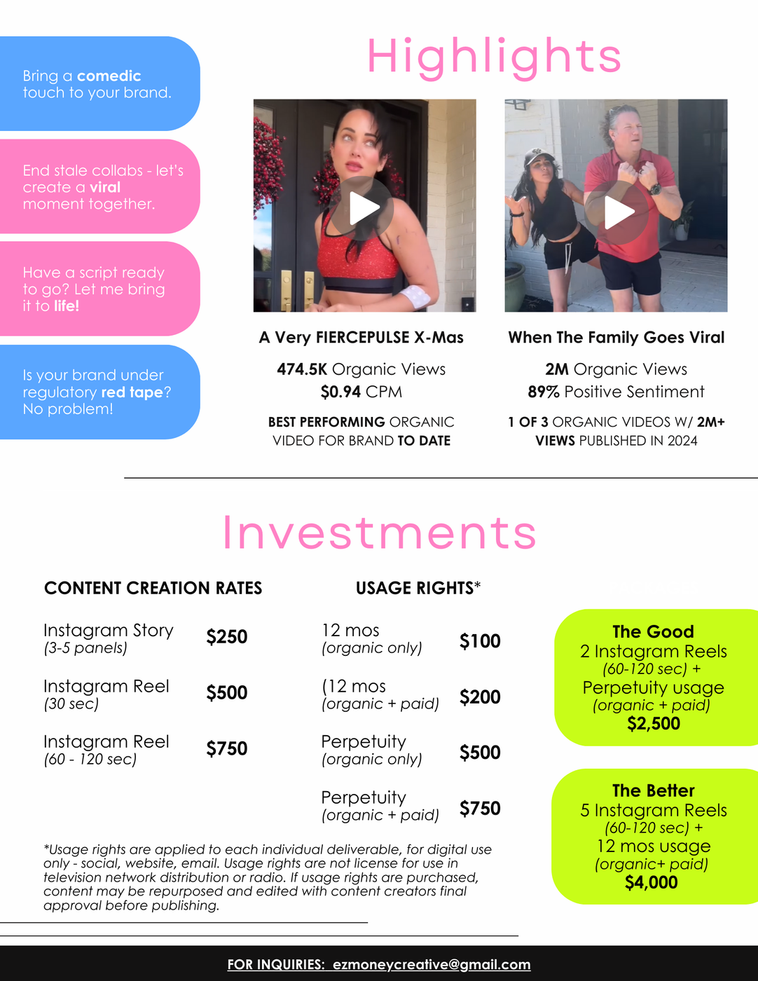 I enjoy working with brands that prefer humor and entertainment to bring customers closer to their brand. I am passionate about helping the consumer world laugh more often and make intentional and meaningful buying decisions.